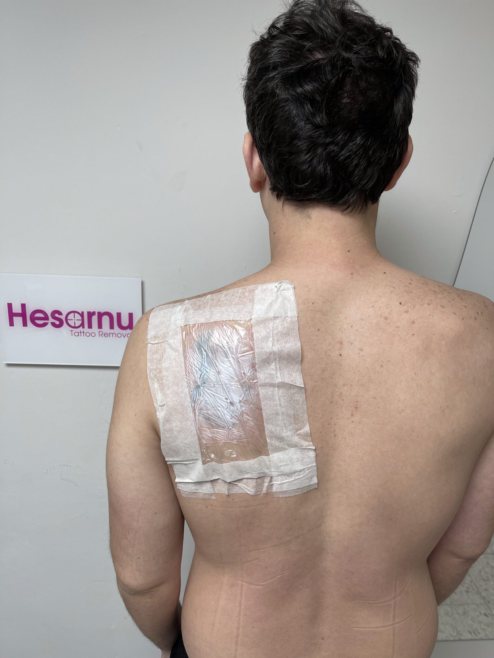 3 שעות קודם הטיפול, מומלץ למרוח משחת אלחוש (בשכבה עבה) על הקעקוע ולעטוף בניילון.